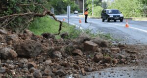 Trabzon’un Akçaabat ilçesinde meydana gelen toprak kayması nedeniyle Sera Gölü yolunda ulaşım, tek şeritten kontrollü sağlanıyor.